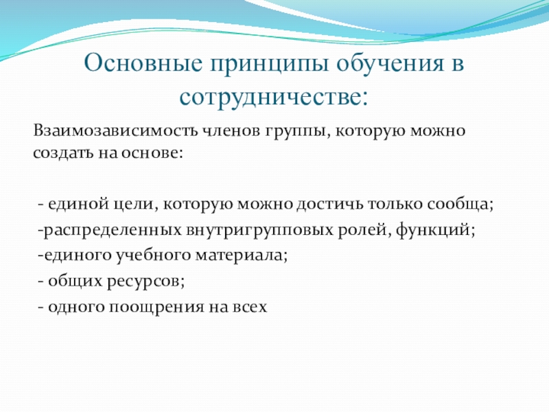 Основные принципы обучения в сотрудничестве:Взаимозависимость членов группы, которую можно создать на основе: - единой цели, которую можно