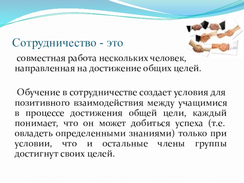 Сотрудничество - это совместная работа нескольких человек, направленная на достижение общих целей. Обучение в сотрудничестве создает условия для позитивного взаимодействия между учащимися в процессе достижения общей цели, каждый понимает, что он может добиться успеха (т.е. овладеть