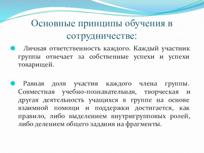 Основные принципы обучения в сотрудничестве: Личная ответственность каждого. Каждый участник группы отвечает за собственные успехи и успехи