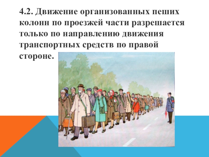 Слайд 44.2. Движение организованных пеших колонн по проезжей части разрешается только по направлению