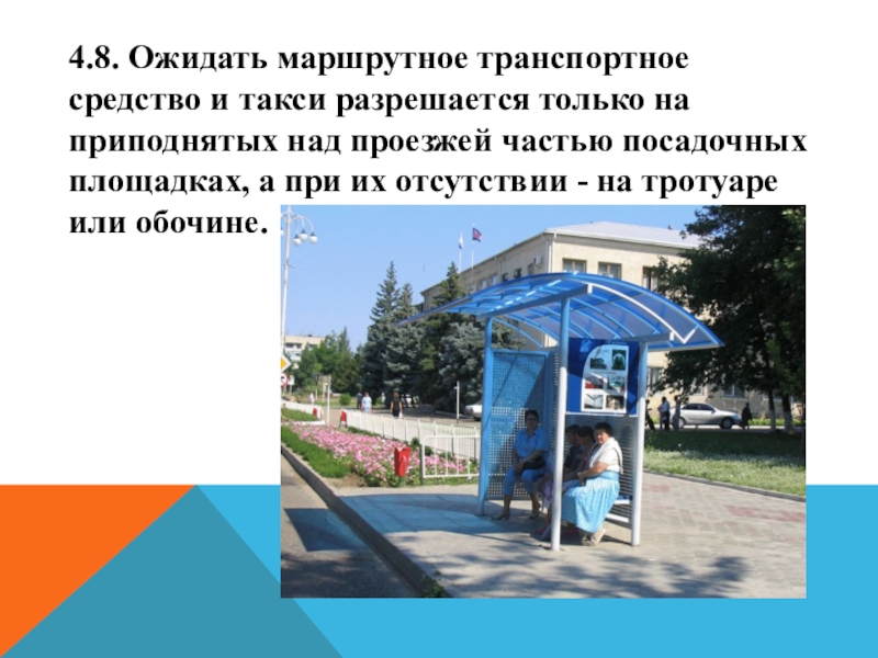 Слайд 104.8. Ожидать маршрутное транспортное средство и такси разрешается только на приподнятых