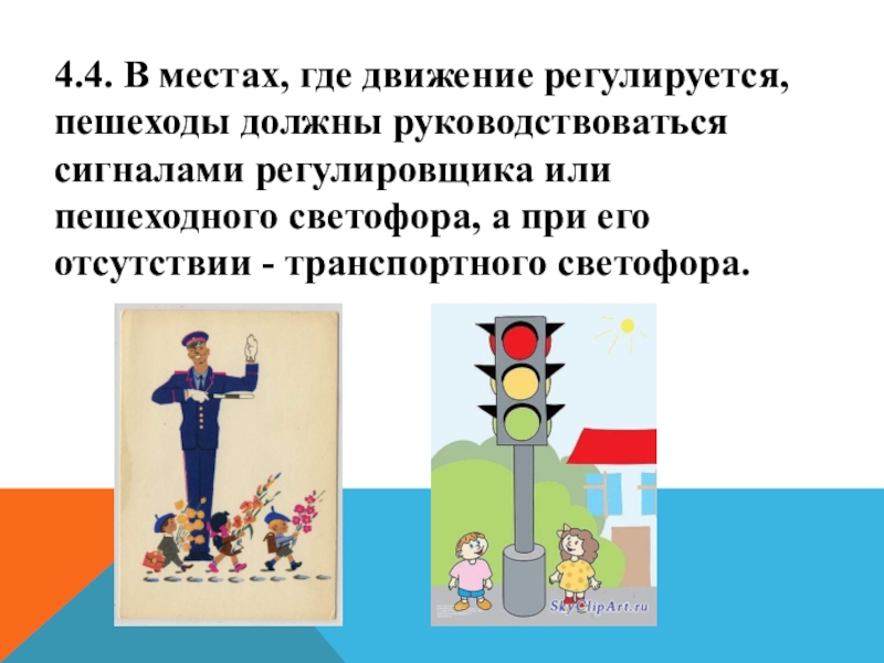 Слайд 64.4. В местах, где движение регулируется, пешеходы должны руководствоваться сигналами регулировщика