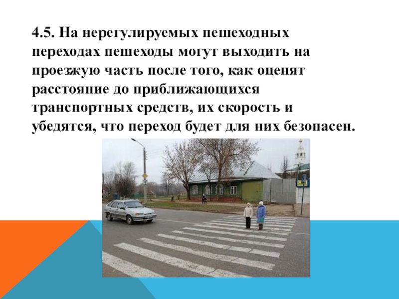 Слайд 74.5. На нерегулируемых пешеходных переходах пешеходы могут выходить на проезжую часть