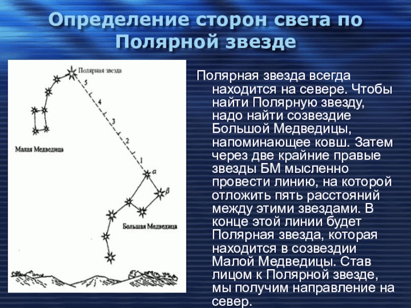 Чтобы найти Полярную звезду, надо найти созвездие Большой Медведицы, напоминающее ковш. Затем через две крайние правые звезды БМ мысленно провести линию, на которой отложить пять расстояний между этими звездами. В конце этой линии будет Полярная звезда, которая находится в созвездии Малой Медведицы. Став лицом к Полярной звезде, мы получим направление на север.