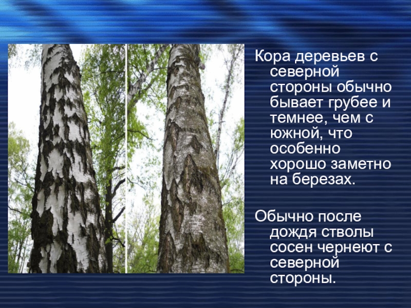 Слайд 18Кора деревьев с северной стороны обычно бывает грубее и темнее, чем