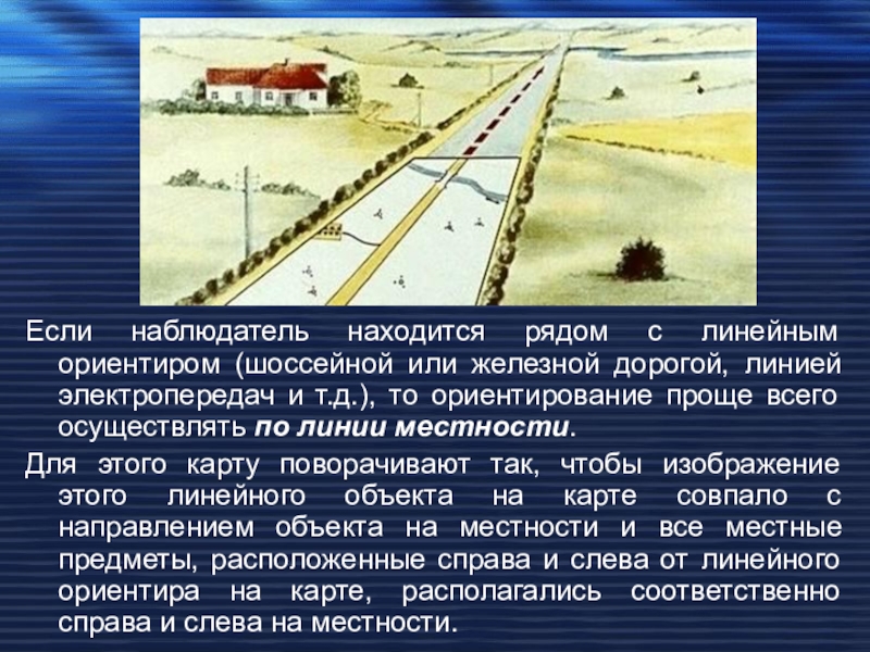 Слайд 11Если наблюдатель находится рядом с линейным ориентиром (шоссейной или железной дорогой,