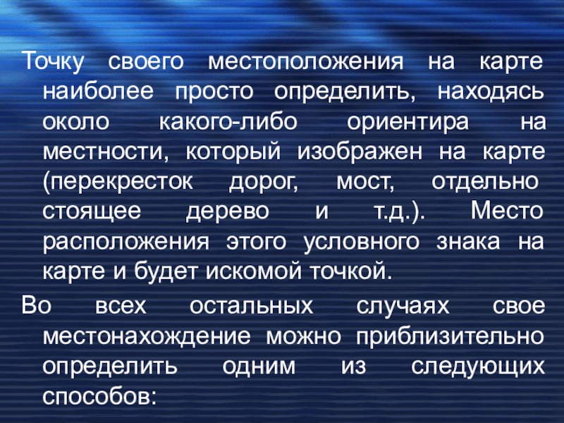 Слайд 13Точку своего местоположения на карте наиболее просто определить, находясь около какого-либо