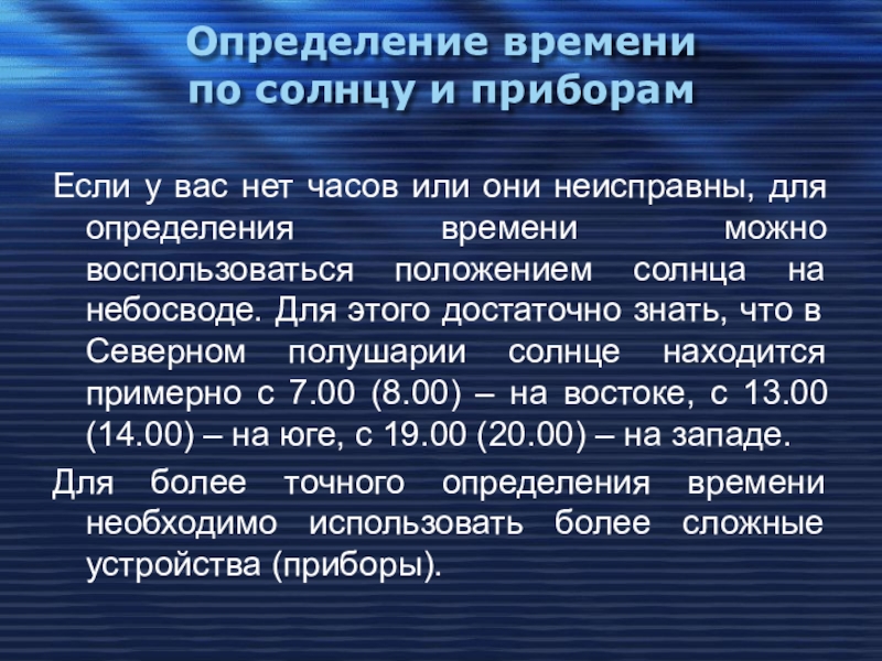 они неисправны, для определения времени можно воспользоваться положением солнца на небосводе. Для этого достаточно знать, что в Северном полушарии солнце находится примерно с 7.00 (8.00) – на востоке, с 13.00 (14.00) – на юге, с 19.00 (20.00) – на западе.