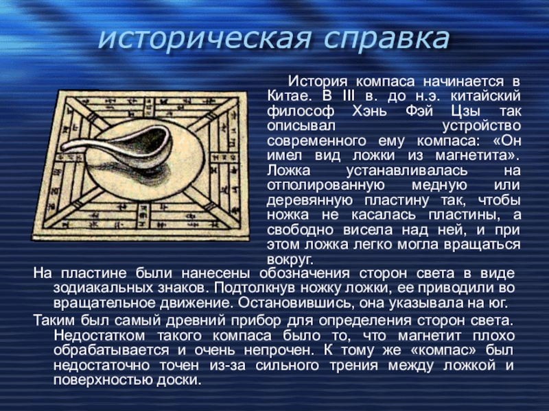 История компаса начинается в Китае. В III в. до н.э. китайский философ Хэнь Фэй Цзы так описывал устройство современного ему компаса: «Он имел вид ложки из магнетита». Ложка устанавливалась на отполированную медную или деревянную пластину так, чтобы ножка не касалась пластины, а свободно висела над ней, и при этом ложка легко могла вращаться вокруг.