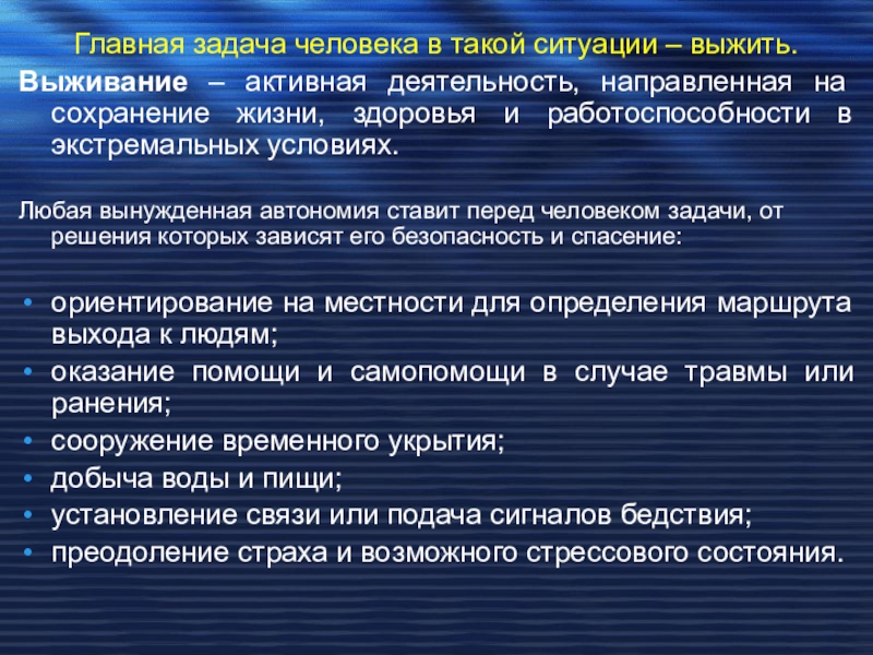 Слайд 5Главная задача человека в такой ситуации – выжить.