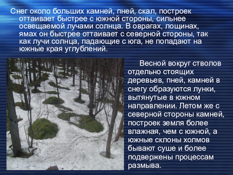 Слайд 20Снег около больших камней, пней, скал, построек оттаивает быстрее с южной