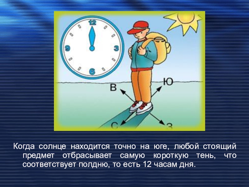 Слайд 25Когда солнце находится точно на юге, любой стоящий предмет отбрасывает самую