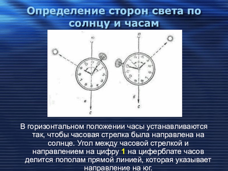 так, чтобы часовая стрелка была направлена на солнце. Угол между часовой стрелкой и направлением на цифру 1 на циферблате часов делится пополам прямой линией, которая указывает направление на юг.