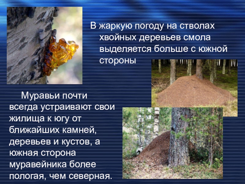 Слайд 19В жаркую погоду на стволах хвойных деревьев смола выделяется больше с