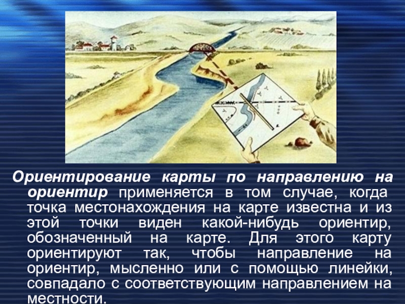 Слайд 12Ориентирование карты по направлению на ориентир применяется в том случае, когда