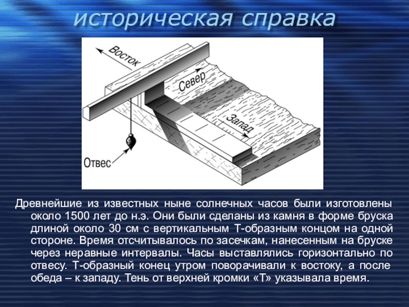 лет до н.э. Они были сделаны из камня в форме бруска длиной около 30 см с вертикальным Т-образным концом на одной стороне. Время отсчитывалось по засечкам, нанесенным на бруске через неравные интервалы. Часы выставлялись горизонтально по отвесу. Т-образный конец утром поворачивали к востоку, а после обеда – к западу. Тень от верхней кромки «Т» указывала время.