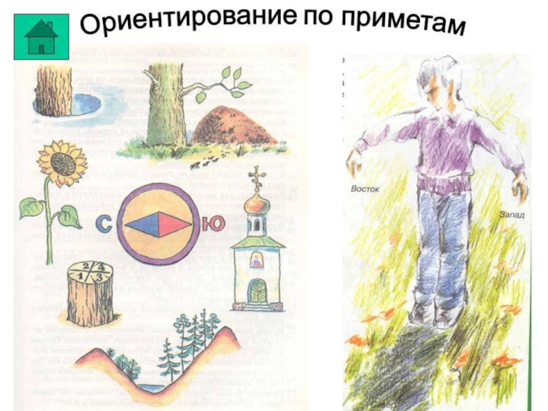 на стороны горизонта (стороны света): север, юг, запад, восток; определить свое местоположение относительно окружающих предметов, найти нужное направление движения и выдержать это направление в пути.
