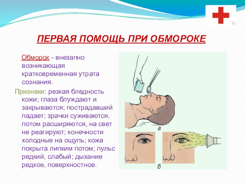 резкая бледность кожи; глаза блуждают и закрываются; пострадавший падает; зрачки суживаются, потом расширяются, на свет не реагируют; конечности холодные на ощупь; кожа покрыта липким потом; пульс редкий, слабый; дыхание редкое, поверхностное.