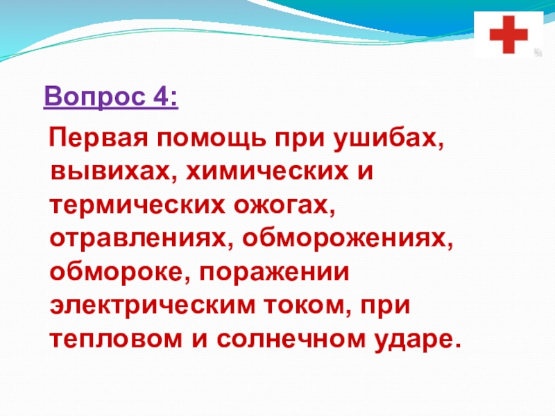 4.Первая помощь при ушибах, вывихах, химических и термических ожогах, отравлениях, обморожениях, обмороке, поражении электрическим током, при теплом и солнечном ударе.