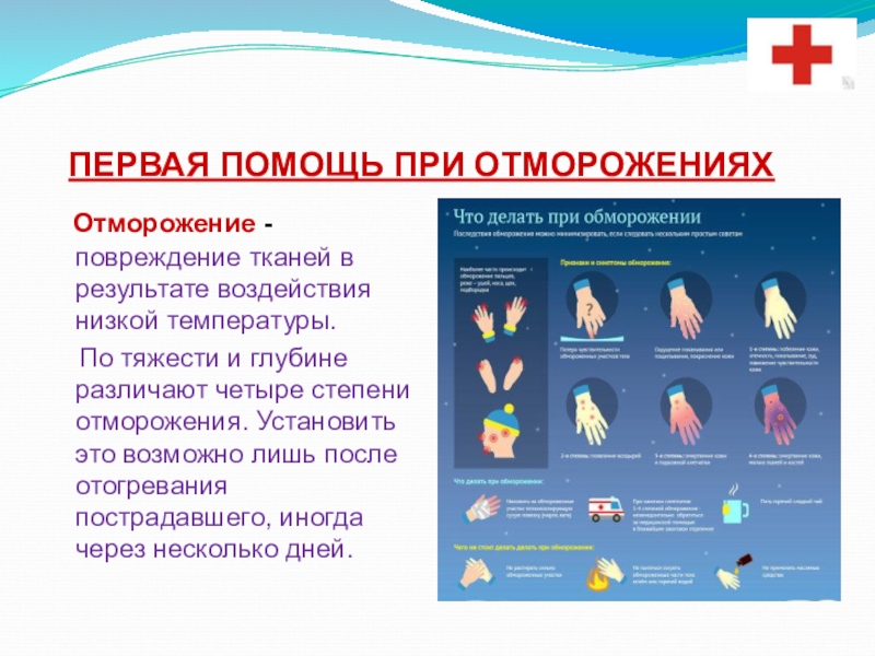 Слайд 27ПЕРВАЯ ПОМОЩЬ ПРИ ОТМОРОЖЕНИЯХ