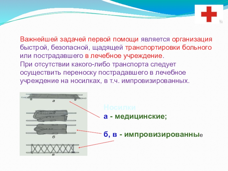 При отсутствии какого-либо транспорта следует осуществить переноску пострадавшего в лечебное учреждение на носилках, в т.ч. импровизированных.