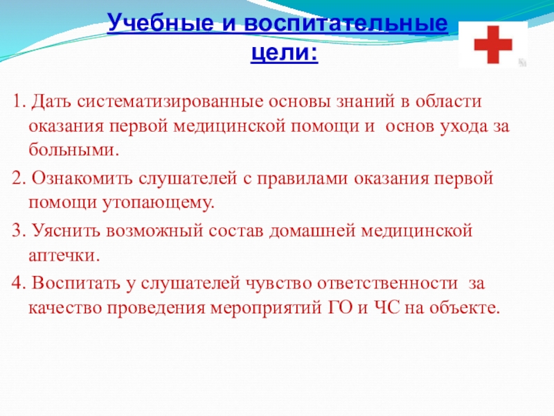 1. Дать систематизированные основы знаний в области оказания первой медицинской помощи и основ ухода за больными.