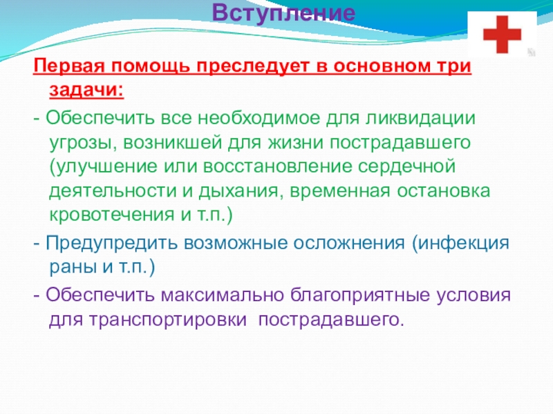 - Обеспечить все необходимое для ликвидации угрозы, возникшей для жизни пострадавшего (улучшение или восстановление сердечной деятельности и дыхания, временная остановка кровотечения и т.п.)