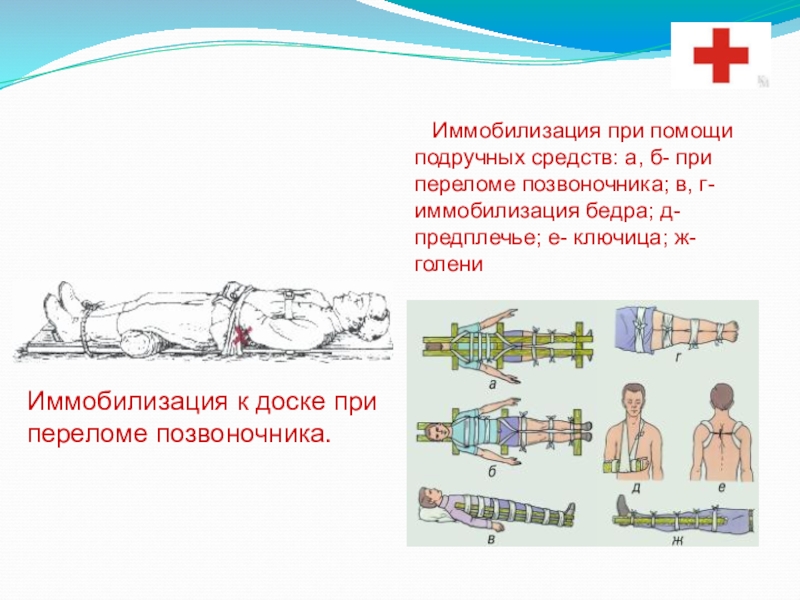 Слайд 15Иммобилизация к доске при переломе позвоночника.