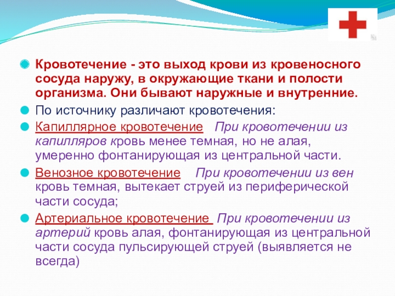 Слайд 9Кровотечение - это выход крови из кровеносного сосуда наружу, в окружающие