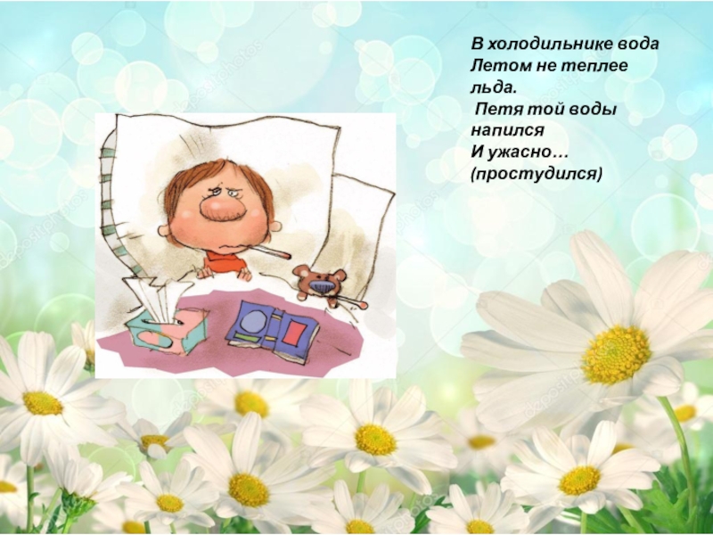 В холодильнике вода Летом не теплее льда. Петя той воды напился И ужасно… (простудился)