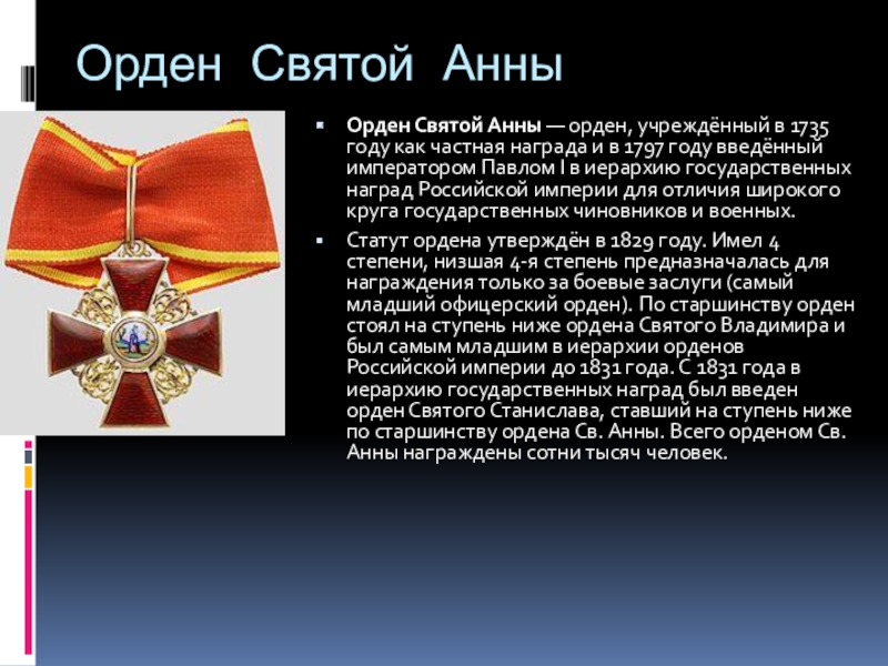 Статут ордена утверждён в 1829 году. Имел 4 степени, низшая 4-я степень предназначалась для награждения только за боевые заслуги (самый младший офицерский орден). По старшинству орден стоял на ступень ниже ордена Святого Владимира и был самым младшим в иерархии орденов Российской империи до 1831 года. С 1831 года в иерархию государственных наград был введен орден Святого Станислава, ставший на ступень ниже по старшинству ордена Св. Анны. Всего орденом Св. Анны награждены сотни тысяч человек.