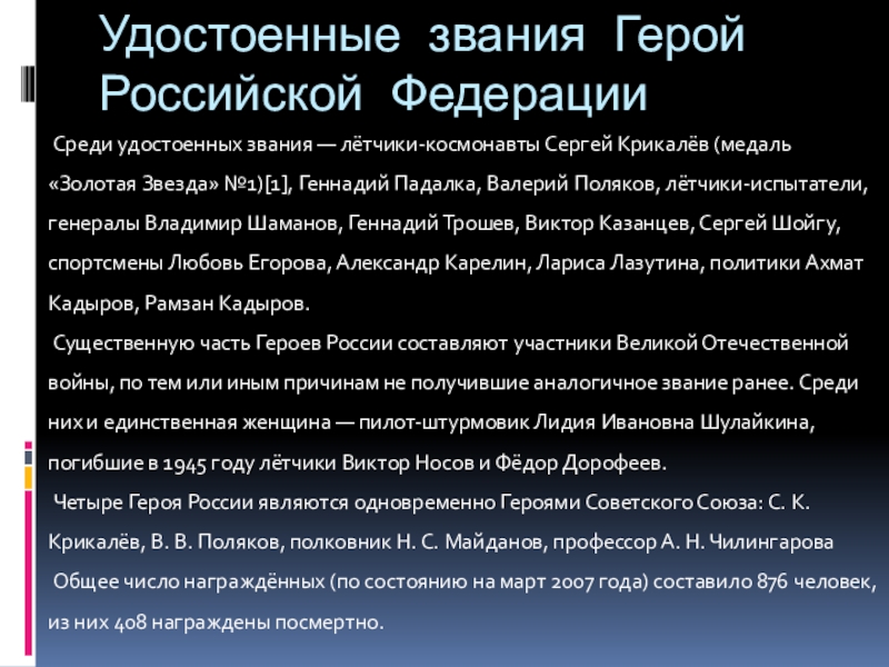 Слайд 12Удостоенные звания Герой Российской Федерации
