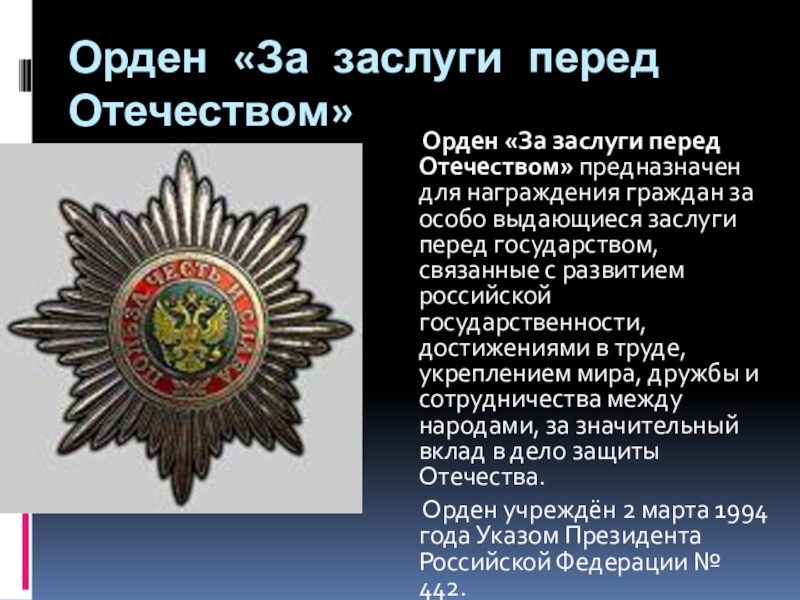 Слайд 7Орден «За заслуги перед Отечеством»