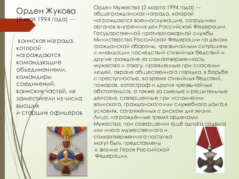 Орден Мужества (2 марта 1994 года) — общегражданская награда, которой награждаются военнослужащие, сотрудники органов внутренних дел Российской Федерации, Государственной противопожарной службы Министерства Российской Федерации по делам гражданской обороны, чрезвычайным ситуациям и ликвидации последствий стихийных бедствий и другие граждане за самоотверженность, мужество и отвагу, проявленные при спасении людей, охране общественного порядка, в борьбе с преступностью, во время стихийных бедствий, пожаров, катастроф и других чрезвычайных обстоятельств, а также за смелые и решительные действия, совершенные при исполнении воинского, гражданского или служебного долга в условиях, сопряжённых с риском для жизни.