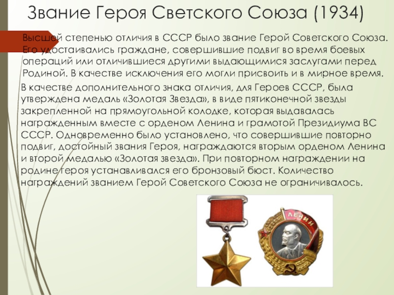 В качестве дополнительного знака отличия, для Героев СССР, была утверждена медаль «Золотая Звезда», в виде пятиконечной звезды закрепленной на прямоугольной колодке, которая выдавалась награжденным вместе с орденом Ленина и грамотой Президиума ВС СССР. Одновременно было установлено, что совершившие повторно подвиг, достойный звания Героя, награждаются вторым орденом Ленина и второй медалью «Золотая звезда». При повторном награждении на родине героя устанавливался его бронзовый бюст. Количество награждений званием Герой Советского Союза не ограничивалось.