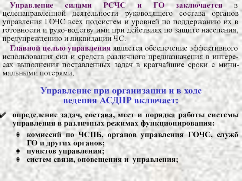 Главной целью управления является обеспечение эффективного использования сил и средств различного предназначения в интере-сах выполнения поставленных задач в кратчайшие сроки с мини-мальными потерями.
