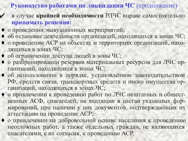 никто не вправе вмешиваться в деятельность РЛЧС по руко-водству работами по ЛЧС, иначе как отстранив их в уста-новленном порядке от исполнения обязанностей и приняв руководство на себя или назначив другое должностное лицо;