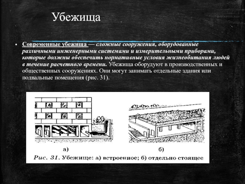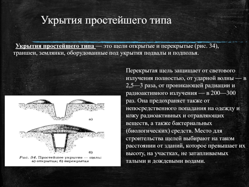 Перекрытая щель защищает от светового излучения полностью, от ударной волны — в 2,5—3 раза, от проникающей радиации и радиоактивного излучения — в 200—300 раз. Она предохраняет также от непосредственного попадания на одежду и кожу радиоактивных и отравляющих веществ, а также бактериальных (биологических) средств. Место для строительства щелей выбирают на таком расстоянии от зданий, которое превышает их высоту, на участках, не затапливаемых талыми и дождевыми водами.