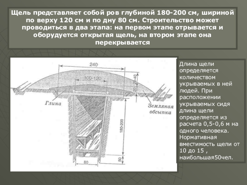 Длина щели определяется количеством укрываемых в ней людей. При расположении укрываемых сидя длина щели определяется из расчета 0,5-0,6 м на одного человека. Нормативная вместимость щели от 10 до 15 ,наибольшая50чел.