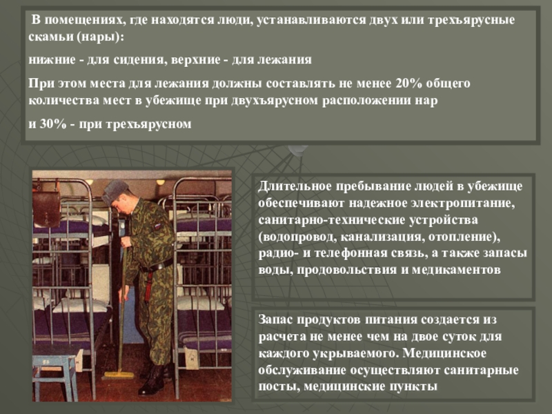 Если в убежище предстоит находиться длительное время, людям создаются условия для отдыха. Уборка помещений производится два раза в сутки самими укрываемыми по указанию старших групп