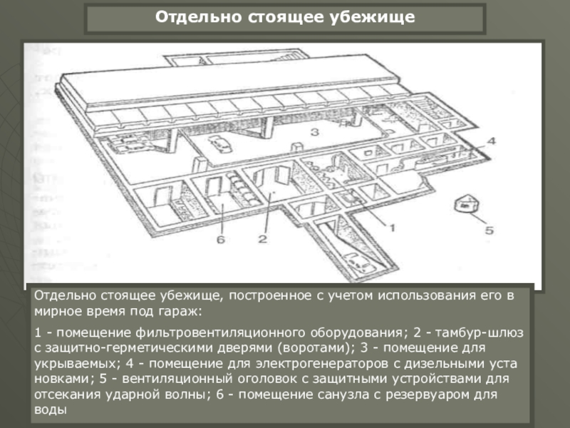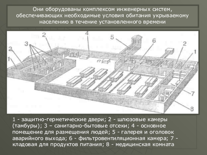 1 - защитно-герметические двери; 2 - шлюзовые камеры (тамбуры); 3 – санитарно-бытовые отсеки; 4 - основное помещение для размещения людей; 5 - галерея и оголовок аварийного выхода; 6 - фильтровентиляционная камера; 7 - кладовая для продуктов питания; 8 - медицинская комната