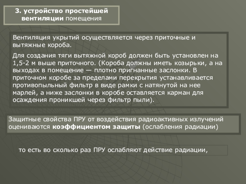Оно очищает наружный воздух, распределяет его по помещениям и создает в сооружении избыточное деление (подпор), препятствующее проникновению зараженного воздуха через возможные не плотности.