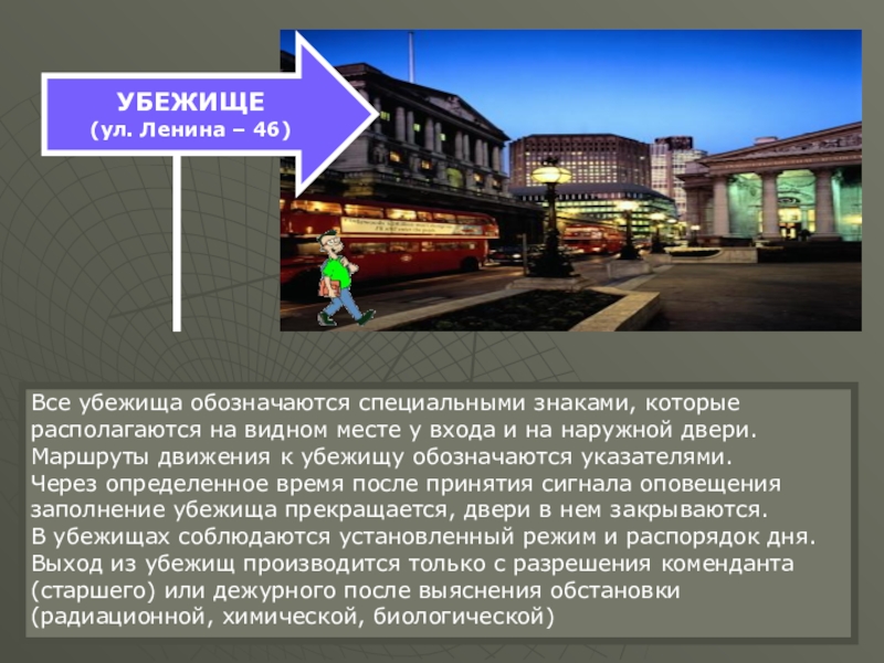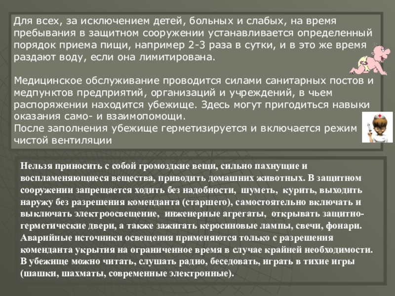 Нельзя приносить с собой громоздкие вещи, сильно пахнущие и воспламеняющиеся вещества, приводить домашних животных. В защитном сооружении запрещается ходить без надобности, шуметь, курить, выходить наружу без разрешения коменданта (старшего), самостоятельно включать и выключать электроосвещение, инженерные агрегаты, открывать защитно-герметические двери, а также зажигать керосиновые лампы, свечи, фонари. Аварийные источники освещения применяются только с разрешения коменданта укрытия на ограниченное время в случае крайней необходимости. В убежище можно читать, слушать радио, беседовать, играть в тихие игры (шашки, шахматы, современные электронные).