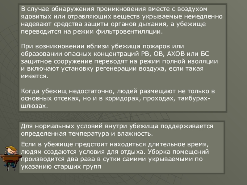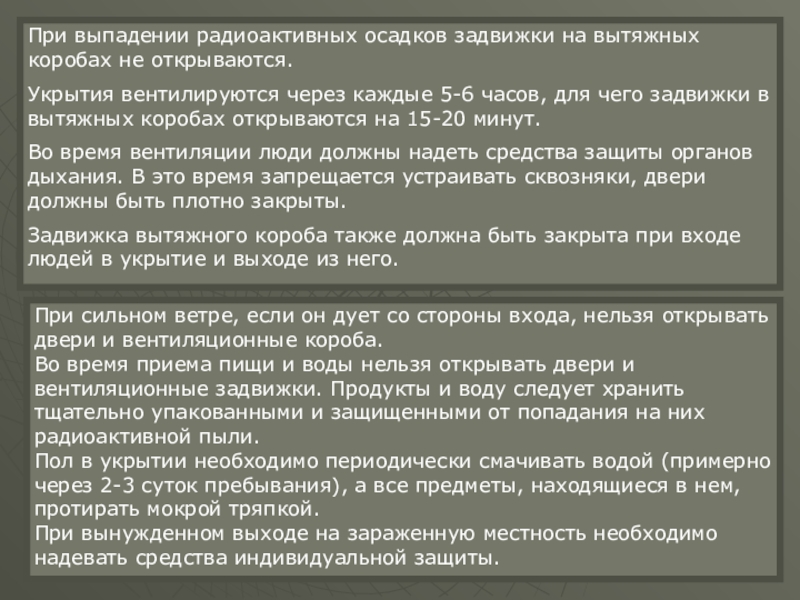 Пол в укрытии необходимо периодически смачивать водой (примерно через 2-3 суток пребывания), а все предметы, находящиеся в нем, протирать мокрой тряпкой.