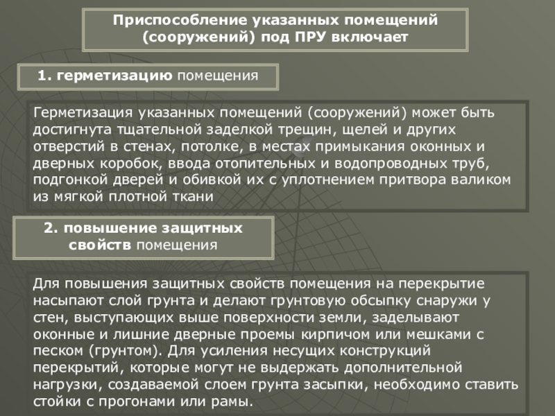 Для повышения защитных свойств помещения на перекрытие насыпают слой грунта и делают грунтовую обсыпку снаружи у стен, выступающих выше поверхности земли, заделывают оконные и лишние дверные проемы кирпичом или мешками с песком (грунтом). Для усиления несущих конструкций перекрытий, которые могут не выдержать дополнительной нагрузки, создаваемой слоем грунта засыпки, необходимо ставить стойки с прогонами или рамы.