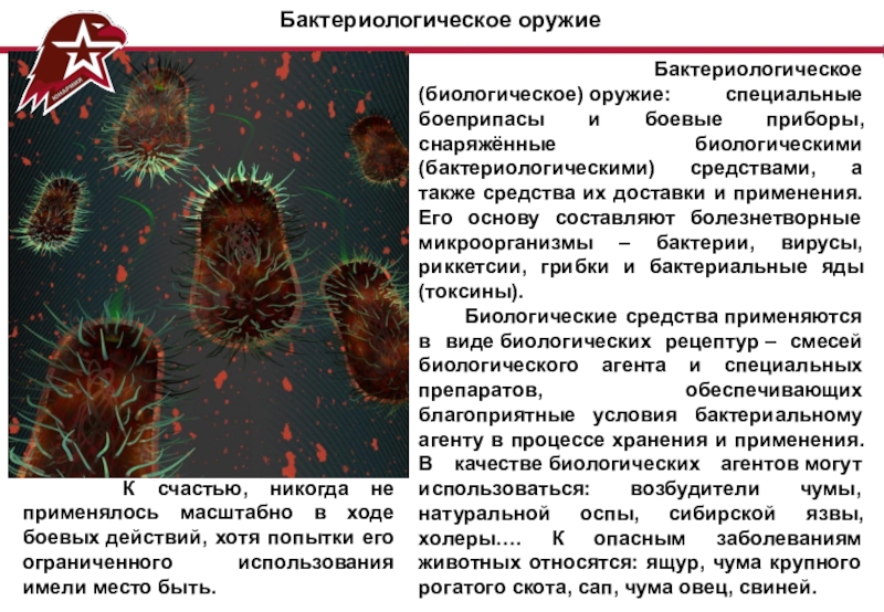 К счастью, никогда не применялось масштабно в ходе боевых действий, хотя попытки его ограниченного использования имели место быть.