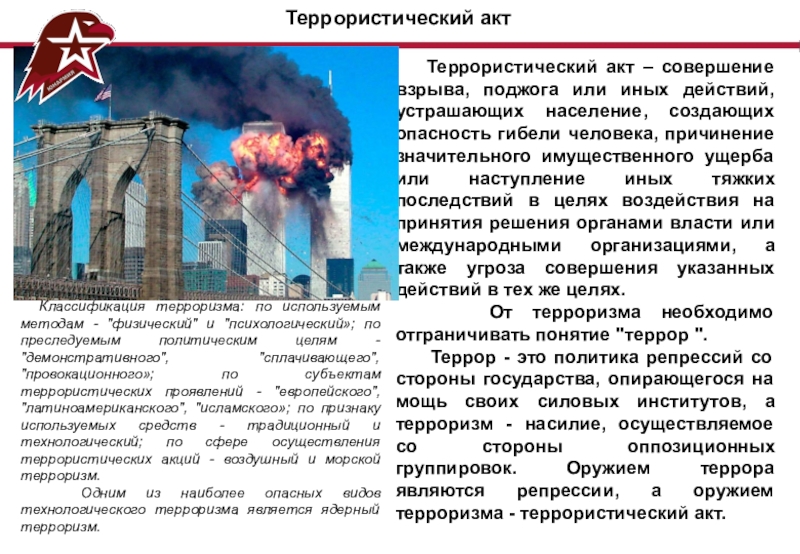 Классификация терроризма: по используемым методам - "физический" и "психологический»; по преследуемым политическим целям - "демонстративного", "сплачивающего", "провокационного»; по субъектам террористических проявлений - "европейского", "латиноамериканского", "исламского»; по признаку используемых средств - традиционный и технологический; по сфере осуществления террористических акций - воздушный и морской терроризм.