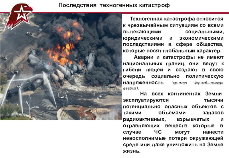 В зависимости от вида производства, аварии и катастрофы на промышленных объектах и транспорте могут сопровождаться взрывами, выходом ОХВ, выбросом радиоактивных веществ, возникновением пожаров т.п. В большинстве случаев техногенная катастрофа возникает вследствие умышленных или неумышленных действий человека.