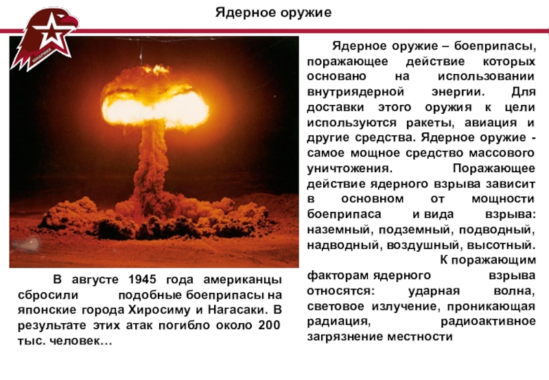 В августе 1945 года американцы сбросили подобные боеприпасы на японские города Хиросиму и Нагасаки. В результате этих атак погибло около 200 тыс. человек…
