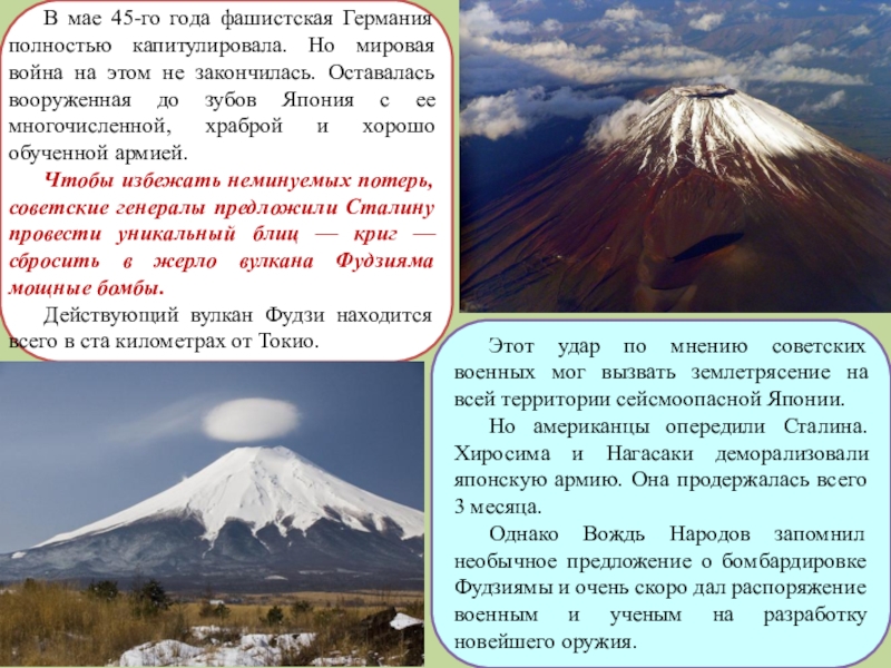 Однако Вождь Народов запомнил необычное предложение о бомбардировке Фудзиямы и очень скоро дал распоряжение военным и ученым на разработку новейшего оружия.